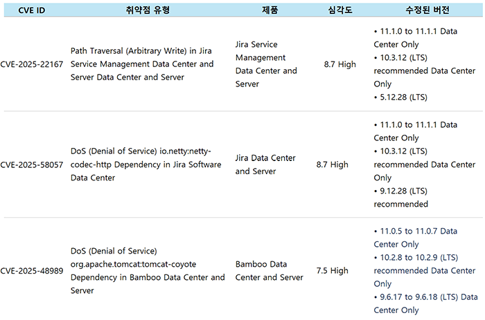 아래에 기재된 Fixed Version은 공지 발행일(2025년 10월 21일) 기준이며, 가장 최신 버전은 각 제품의 Release Notes를 통해 확인 가능합니다.