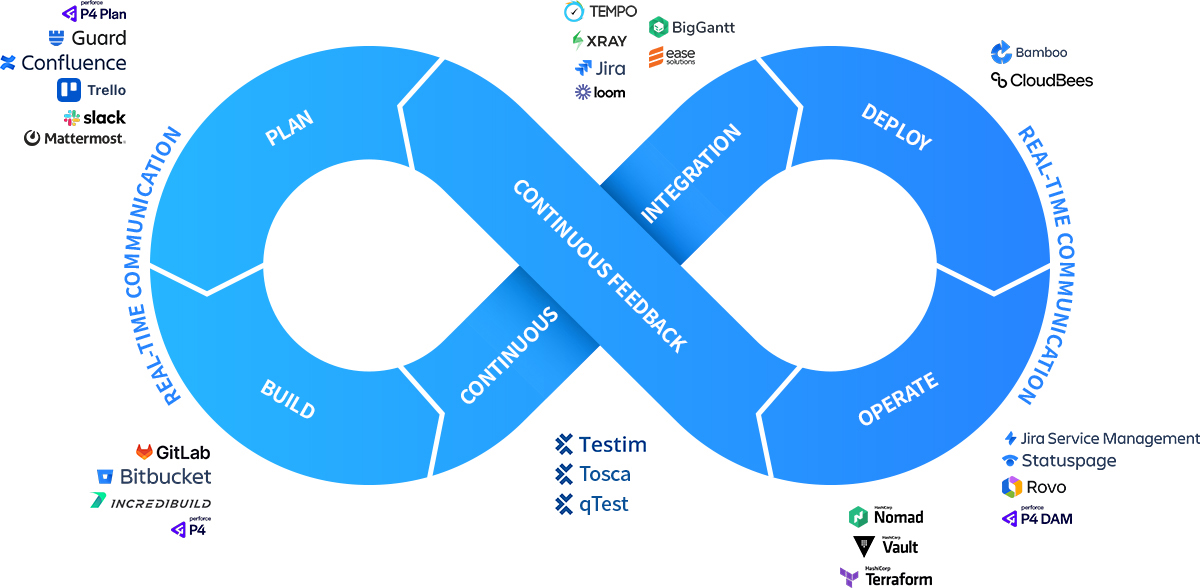 플래티어가 제안하는 Open DevOps 아키텍처는 Plan, Build, Test, Deploy, Operate 등 DevOps 라이프사이클의 전 단계를 포괄하며 각 단계별로 Atlassian 도구와 서드파티 도구가 긴밀하게 결합합니다.